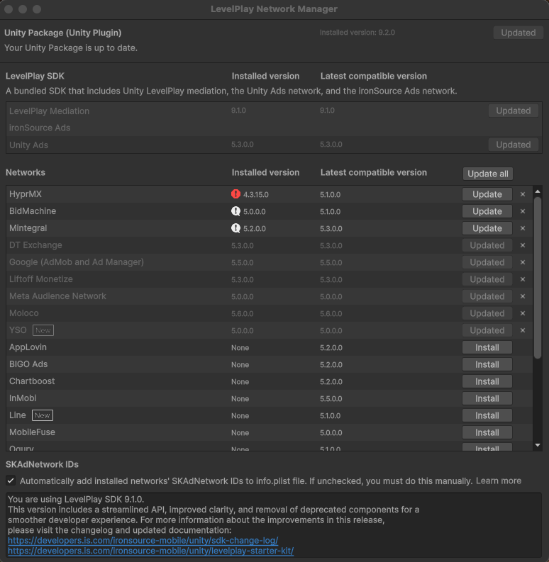 The table below includes all adapters supported for the selected LevelPlay SDK up to version 8.3.0. The LevelPlay SDK provides an easy way to verify that your Mediation integration was completed successfully. To verify your ironSource and additional Ad Networks integration, follow this document.Check LevelPlay SDK & Adapter Compatibility